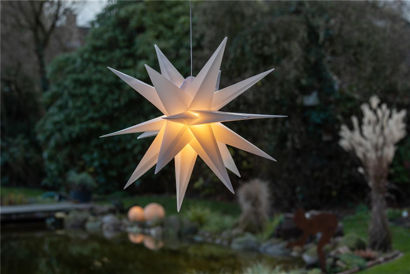 In der Advents- und Weihnachtszeit kann auch der Garten in festlichem Lichterglanz erstrahlen. Hierbei gibt es die unterschiedlichsten Spielarten, seien es Lichterketten, Erdspieße, Netze oder dreidimensionale Figuren, wie Rentierschlitten, Tannenbaum, Stern, Weihnachtsmann & Co. Die meisten der weihnachtlichen Gartenilluminationen werden durch elektrische Lichter bestimmt. Wer auf den ganz natürlichen Charme setzt, kann aber auch mit großen Gartenlaternen eine heimelige Stimmung schaffen. In denen dicke echte Wachskerzen oder alternativ LED-Echtwachskerzen flackern. Bei ersterem ist unbedingt darauf zu achten, dass sich in der unmittelbaren Nähe der Laterne keine leicht brennbaren Materialien befinden.