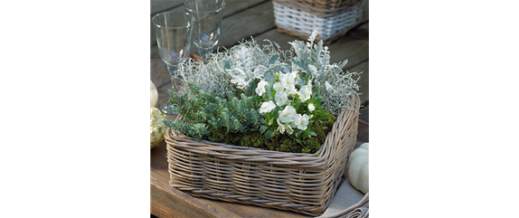 Zum Saisonausklang kann die Farbkraft des Herbstlaubes mit prächtigen Spätblühern in warmen Purpur- und Violett-Tönen wie Schein-Sonnenhut (Echinacea), Aster (Aster) und Chrysantheme (Chrysanthemum) intensiviert werden. Mit dem Hornveilchen (Viola cornuta) setzen Sie auch im Herbst farbenfrohe Blütentupfer. Dank unzähliger Züchtungen gibt es eine große Farb- und Formvielfalt. Passende Leuchtkraft bringen hier Farben wie Rot, Pink, Purpur und Violett. Ein besonderer Hingucker in prächtigem Violett ist der Zierkohl (Brassica). Er bildet kompakte Köpfe mit glatten, gewellten oder krausen Blättern, je nach Sorte. Seine Farbe leuchtet besonders intensiv, je kühler es wird. Herbstliches Flair verbreitet ein Potpourri aus Zierkohl, Erika (Erica) und Alpenveilchen (Cyclamen), das noch mit Zierk¸rbis und einer schönen Laterne dekoriert werden kann.