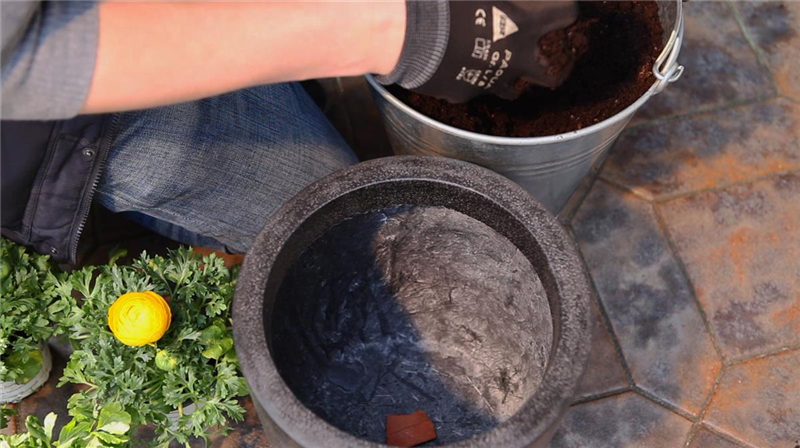 Bevor Sie handelsübliche Blumenerde in den Topf füllen, sollten Sie das Loch aber leicht bedecken: Zum Beispiel mit einer Tonscherbe. Diese verhindert, dass das Abzugsloch verstopft.