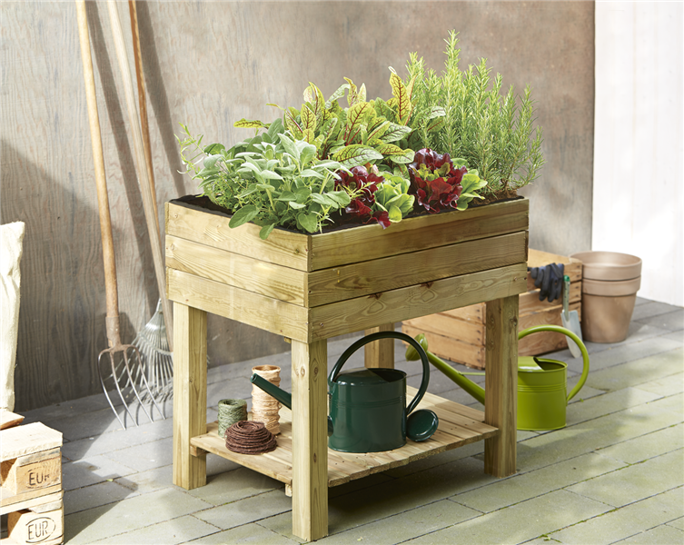 Mit dem Hochbeet auf Kiefernholz und einer cleveren Ablage steht Ihrer eigenen Ernte auf dem Balkon