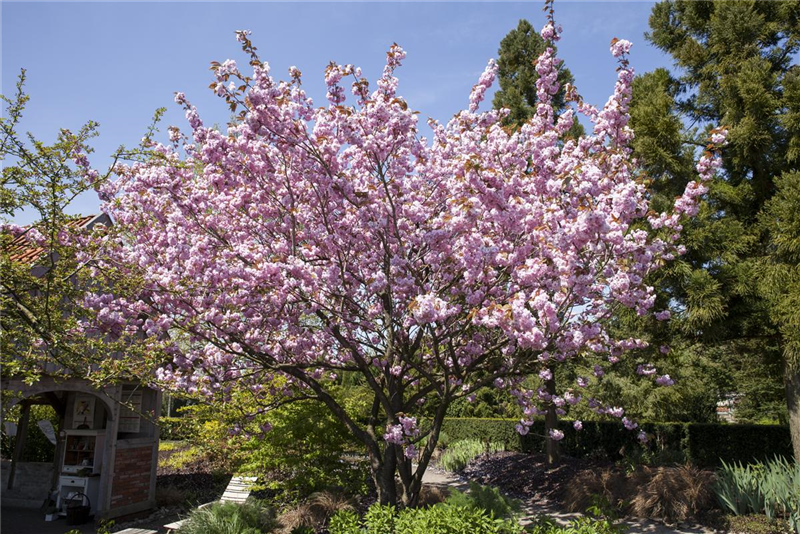 Die Zwergzierkirsche ( Prunus serrulata ) kommt aus der Familie der Rosengewächse. Je nach Wetterverhältnissen blüht sie drei bis vier Wochen lang. Sie wächst sehr kompakt und wird bis zu 10 m groß. Besonders hübsch sind ihre leicht gedrehten Ästchen. Nach der Blüte sollte sie zurückgeschnitten werden, damit sie in der nächsten Saison wieder in voller Schönheit bewundert werden kann.