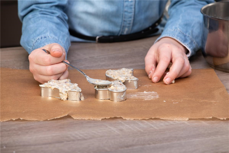 In einem Kochtopf das Fett auf niedriger Stufe erwärmen. Sobald es flüssig ist, den Topf vom Herd nehmen und leicht abkühlen lassen. Um zu verhindern, dass die Masse später in der Kälte zu hart und brüchig wird, kann ein Schuss Salatöl eingerührt werden. Danach die Getreideflocken, Körner, Obststücke und Saaten hinzugeben. Es sollten so viele trockene Zutaten eingerührt werden, dass die Masse klumpig wird. Die Äste in das jeweilige Behältnis stecken und zwar so, dass sie unterhalb mindestens zehn Zentimeter hinausragen. Am besten vorher an das Geäst direkt den Bindfaden befestigen. Die Aufhängung sollte dann oberhalb des Gefäßes herausschauen. Danach die Fettfutter-Maße einfüllen. Abkühlen lassen. Wurden als Füllgefäße Papierrollen genutzt, können diese nach dem Abkühlen vorsichtig entfernt werden. Der selbstgemachte Futterspender kann nun im Garten an erhöhter Stelle (zum Schutz vor Katzen) aufgehängt werden. Allerdings gilt es zu beachten, dass manche Weichfutterfresser wie etwa Amseln, Drosseln, Goldammern, Bergfink, Heckenbraunelle und Rotkehlchen am liebsten vom Boden fressen – sie mögen aber ohnehin lieber Streufutter.