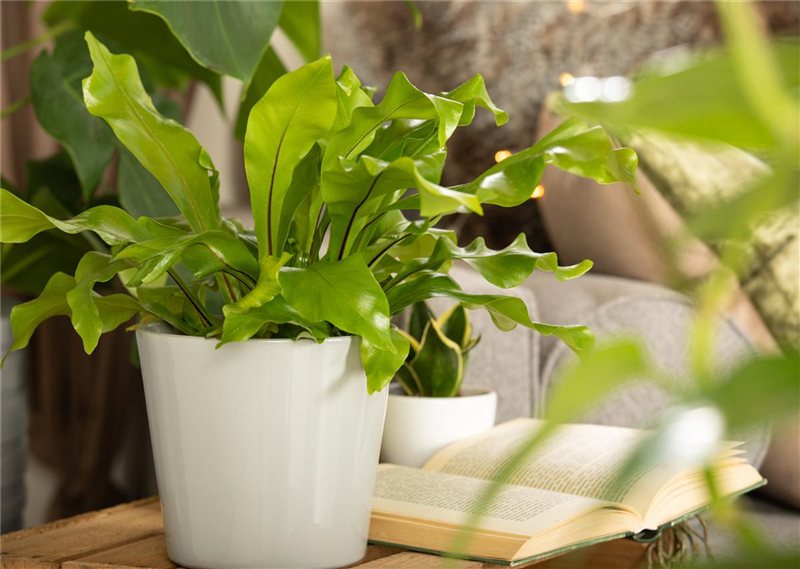 Der Nestfarn (Asplenium antiquum) stammt aus Asien und überzeugt mit leuchtend grünen, spitzen Blättern. Er kann ganzjährig bei Zimmertemperatur an einem hellen Standort, vor direkter Sonneneinstrahlung geschützt, platziert werden. Er benötigt regelmäßige Wassergaben und eine hohe Luftfeuchtigkeit. Der Nestfarn sollte nie vollständig austrocknen oder zu nasses Substrat haben. Übrigens: Neben den optischen Reizen überzeugt der Nestfarn mit einem weiteren Merkmal. Er gibt einen sehr hohen Anteil des Gießwassers an die Raumluft ab und ist daher ein effektiver Raumluftbefeuchter.