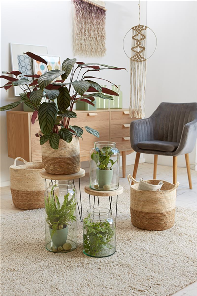 Durchsichtige Glasvasen lassen sich perfekt mit dem Zimmerfarn (Polypodiopsida) befüllen. Mit Körben in natürlichen Tönen unterstreichen Sie gekonnt die verschiedenen Grüntöne Ihrer Zimmerpflanzen.