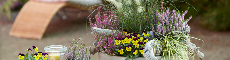 Heidepflanzen zählen im Herbst zu den beliebtesten Pflanzen auf Balkonen und Terrassen. Besonders die sogenannten Knospenblüher, also die Sorten der Besenheide, deren Blüte sich nicht öffnen, zeigen sich wochenlang von ihrer schönsten Seite. Da die Blüten nicht bestäubt werden können, bleiben sie besonders lange attraktiv und trotzen auch Regen, Frost oder anhaltender Feuchtigkeit. Späte Sorten halten sogar bis weit in den Winter. Auch mit blütenlosen Knospenblühern können tolle moderne Akzente in den Pflanzgefäßen gesetzt werden. Die knospenlose Heide wirkt vor allem durch ihr hellgrünes, grünes, gelbes oder orangegelbes Laub als Strukturpflanze und wird am besten mit Blattschmuckpflanzen wie Efeu oder Purpurglöckchen kombiniert. Dazu eine charmante Deko in Form von Baumscheiben, Ästen oder Kürbissen und das herbstliche Stillleben ist perfekt!