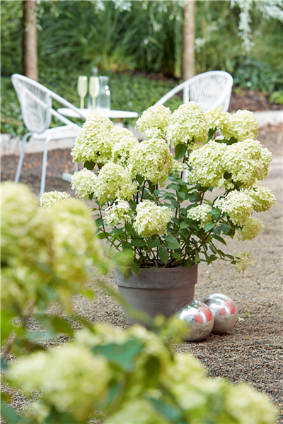 Die Auswahl der Hortensien (Hydrangea) ist enorm. Nicht nur bei den vielen verschiedenen Blütenfarben haben Sie die Qual der Wahl, auch bei den Blütenformen gibt es Unterschiede. Die Rispenhortensie 'Gardenlights' (Hydrangea paniculata) ist eine besondere Schönheit unter den Hortensien. Die großen, kegelförmigen weißen Blüten erstrahlen von Juni bis in den Oktober hinein. An einem sonnigen bis halbschattigen Standort kann sie eine Wuchshöhe bis zu 1 m erreichen. Der sommergrüne und winterharte Strauch verliert auch im Kübel nichts von seiner Zierde.