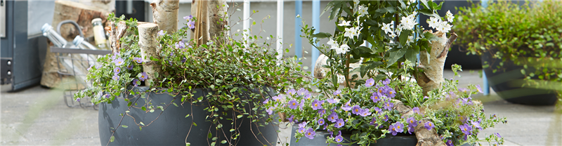 Die Jasmin-Pyramide (Solanum jasminoides) ist ein üppig blühendes Nachtschattengewächs. Mit ihren weißen und feinen Blütendolden entschädigt die Blütenpracht für den fehlenden Geruch. Dieser Jasmin ist gar kein richtiger Jasmin. Den Namen trägt die Pflanze deshalb, weil die Blüten dem echten Jasmin sehr ähnlich sehen. In einem großen, ovalen Kübel mit der Schneeflockenblume (Sutera diffusus) gepflanzt, sieht die Jasmin-Pyramide besonders attraktiv aus. Die Schneeflockenblume stammt aus Südafrika und im Wind wirken ihre Blüten wie Schneeflocken.