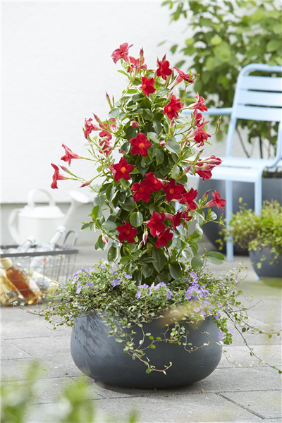 Die Dipladenie-Pyramide (Mandevilla) ist ein echter Dauerblüher im Sommer. Wenn Sie der Pflanze ausreichend Nahrung geben, dann windet sich die immergrüne Schönheit flott in die Höhe. Manche Sorten erreichen eine imposante Höhe von bis zu 6 m. Die rote Schönheit mag es gerne warm, möchte aber vor praller Sonne geschützt werden. In einem größeren Kübel mit der Schneeflockenblume gepflanzt, erhält die Pyramide eine besondere Eleganz.