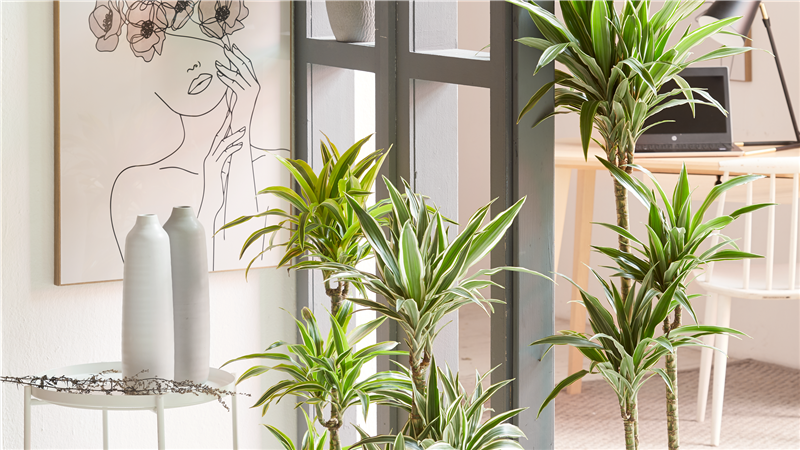 Der Drachenbaum (Dracaena deremensis) beeindruckt in Ihrem Homeoffice-Bereich nicht nur mit seiner Größe, sondern auch mit seinen spitz zulaufenden Blättern. Der botanische Name „Dracaena“ leitet sich von „Drakaina“ ab und bedeutet so viel wie „weiblicher Drachen“. Gemeint ist hiermit das rote Harz, das die Pflanze bei Verletzungen absondert. Dieses „Drachenblut“ wurde im Mittelalter medizinisch genutzt, später veredelte man auch Holzoberflächen damit. Die Zimmerpflanze benötigt einen hellen und warmen Standort, nur dann kann sich das saftige Grün mit gelben, rosafarbenen oder feuerroten Linien vermischen. Gießen Sie die Pflanze regelmäßig.