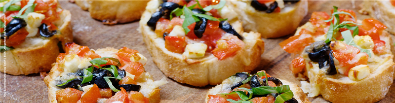 Knoblauch durchdrücken, Basilikum waschen, in Streifen schneiden, Tomaten und Feta würfeln. Knoblauch, Basilikum, Tomaten, Feta, Olivenringe und geriebenen Käse vermengen. Mit Gewürzen abschmecken. Backofen auf 200 °C vorheizen. Baguettescheiben mit der Masse bestreichen, mit etwas Olivenöl beträufeln. Im vorgeheizten Ofen etwa 10 Minuten überbacken