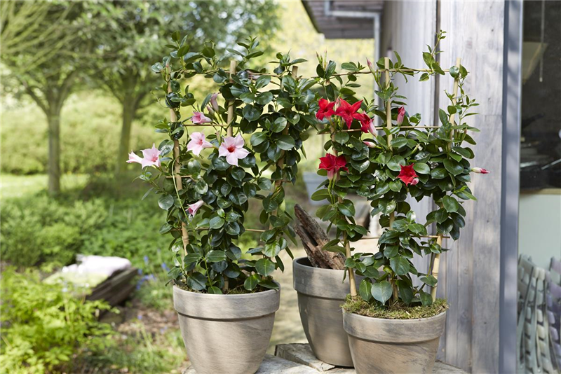 Mandevillen blühen meist ab Mai bis zum Herbst in wunderschönen Trichterblüten in den Farben Gelb, Weiß, Violett und diversen Rottönen. Die Kletterpflanzen benötigen durch ihre dicken Blätter und Speicherwurzeln nur wenig Wasser. Der Wurzelballen sollte zwar immer gut feucht gehalten, aber Staunässe unbedingt vermieden werden. Mit einer Kletterhilfe wird der Wuchs der Schlingpflanze perfekt unterstützt. Da die Pflanze nicht winterhart ist, sollte sie rechtzeitig vor dem ersten Frost in ein helles Überwinterungsquartier bei kühlen 8-12 °C gebracht werden.