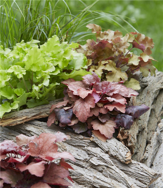 Heuchera wachsen buschig und polsterartig, haben je nach Sorte grün, graugrün bis rote herzförmige Blätter und an ihren schleierartigen langen Blütenrispen tragen sie kleine rote Blütenglöckchen, die es auch als weißblühend gibt. Blütezeit ist von Anfang Juni bis Ende August. Der nährstoffreiche Boden sollte humos, mäßig feucht und gut dräniert sein.