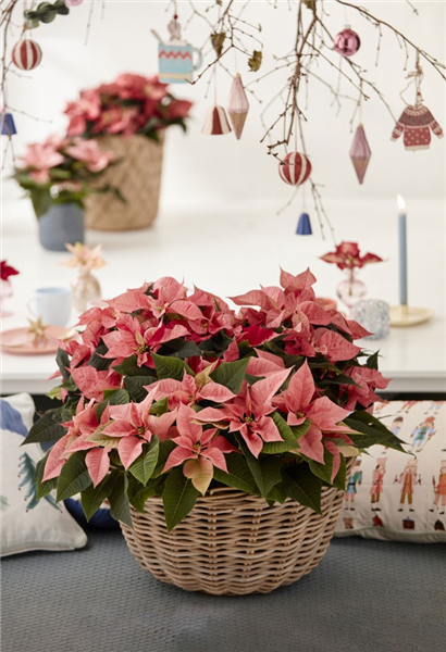 Dekorationselemente sowie Pflanzen in den klassischen Weihnachtsfarben Rot, Weiß und Grün unterstreichen diesen Trend.