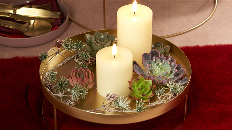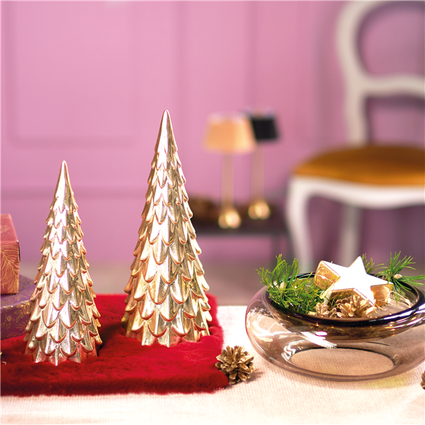 Das goldfarbene Tablett mit elegantem Standfuß in zwei Größen bietet den idealen Rahmen für vielseitige Dekorationen. Darauf sorgen Kerzen aus Kunststoff mit Timerfunktion für warmes Licht und gemütliche Stimmung. Gemeinsam entfalten sie den edlen Charakter des Trends "GLAMOUR TIME"– stilvoll, üppig und ausdrucksstark. Die goldfarbenen Tannen aus Dolomit glänzen mit der Weihnachtszeit um die Wette. Ihre metallische Oberfläche bringt Raffinesse in die Dekoration, einzeln oder im Duo arrangiert. Mit ihrer weichen Formensprache und dem edlen Grauton fügt sich die flache Vase harmonisch in die festliche Inszenierung ein. Ob mit Zweigen, Kerzen oder glänzenden Accessoires bestückt verleiht sie Arrangements eine moderne Note.