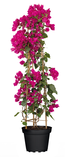 Die DRILLINGSBLUME-PYRAMIDE (Bougainvillea glabra) steht für intensive Farbe und mediterrane Wärme und wirkt dabei besonders fein und elegant. Ihre farbigen Hochblätter leuchten in Pink, Violett oder Rot. Wird die Pflanze eher sparsam gegossen und nicht zu häufig umgestellt, fördert das die Bildung neuer Hochblätter.